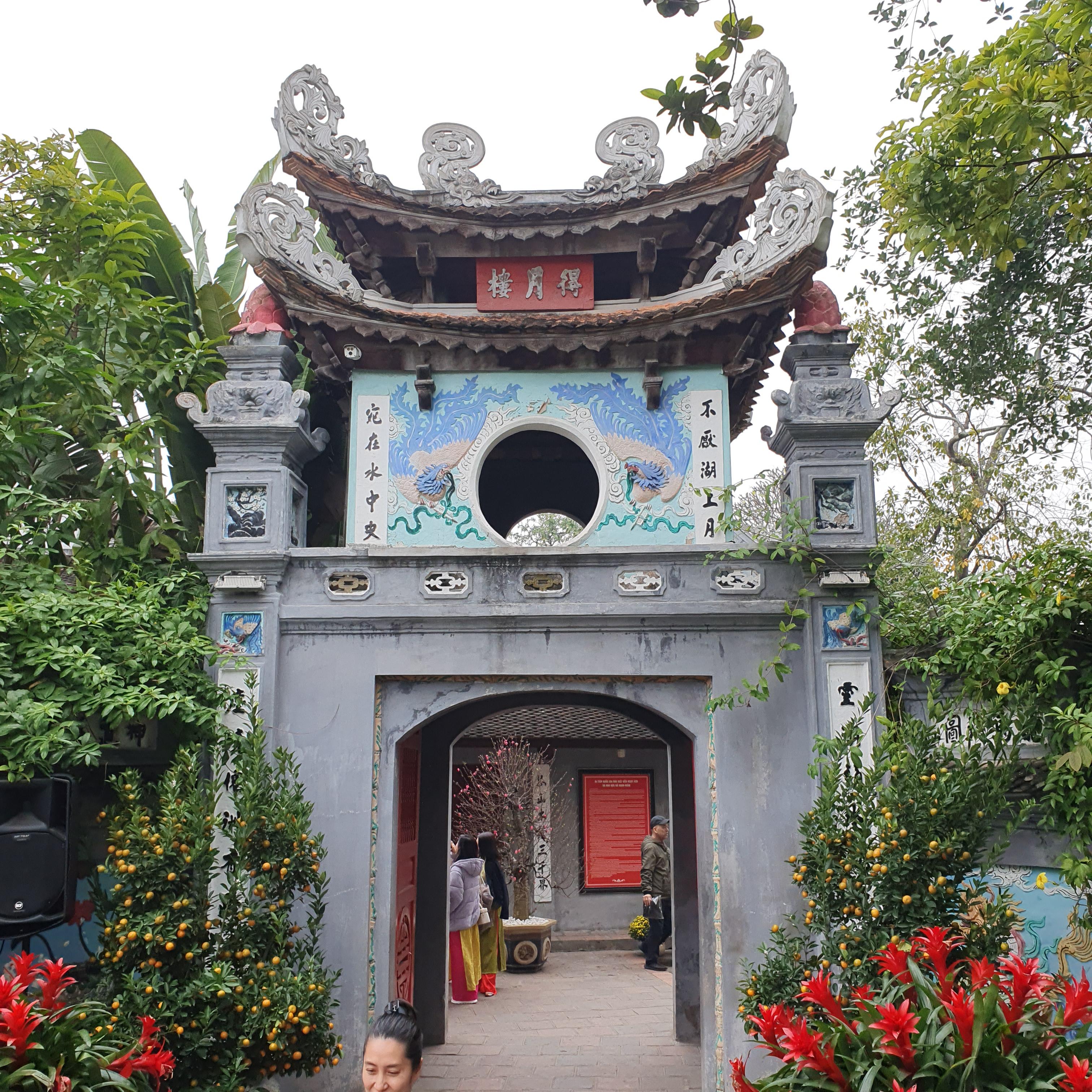 물 위에 있는 Ngoc Son 사원으로 통하는 다리다.