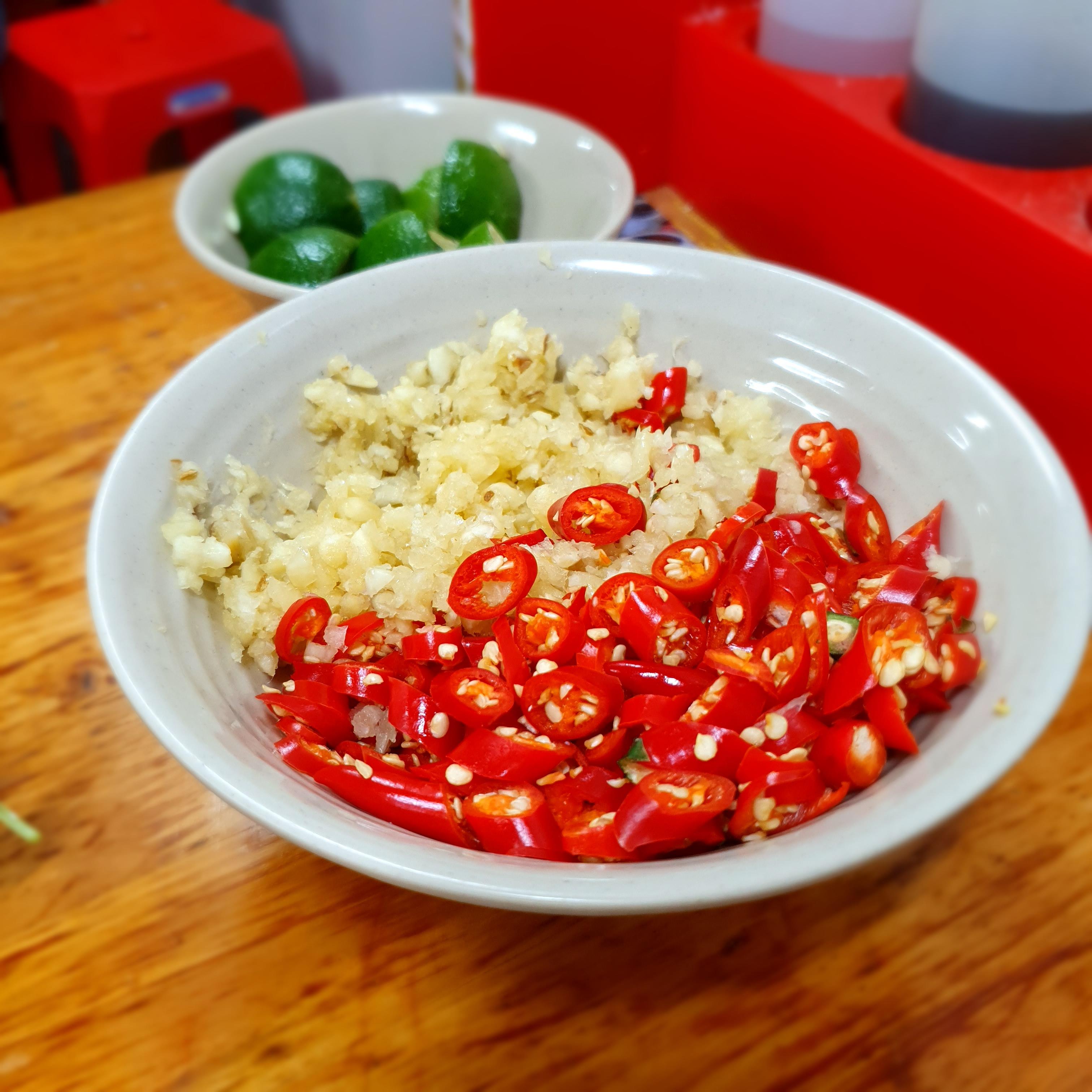 자작한 국물에 담긴 향채 위로 국수와 다진 고기, 튀긴 샬롯과 절인 파파야가 올라간다.